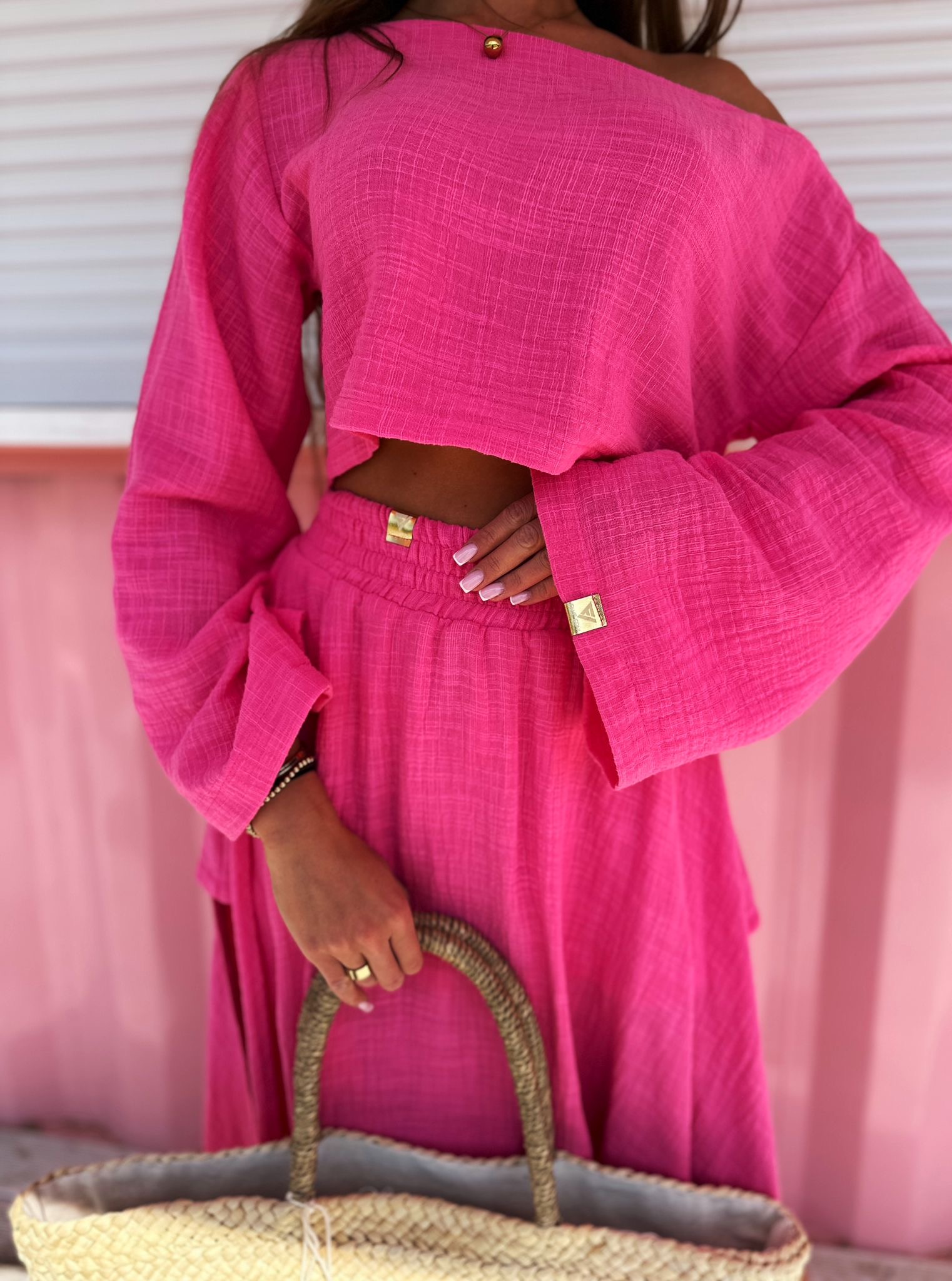 Elegantni pink komplet, ki vsebuje dolgo krilo z všitimi hlačami in široko majico za sodoben a, brezčasen videz. Univerzalna velikost primerna 34-42