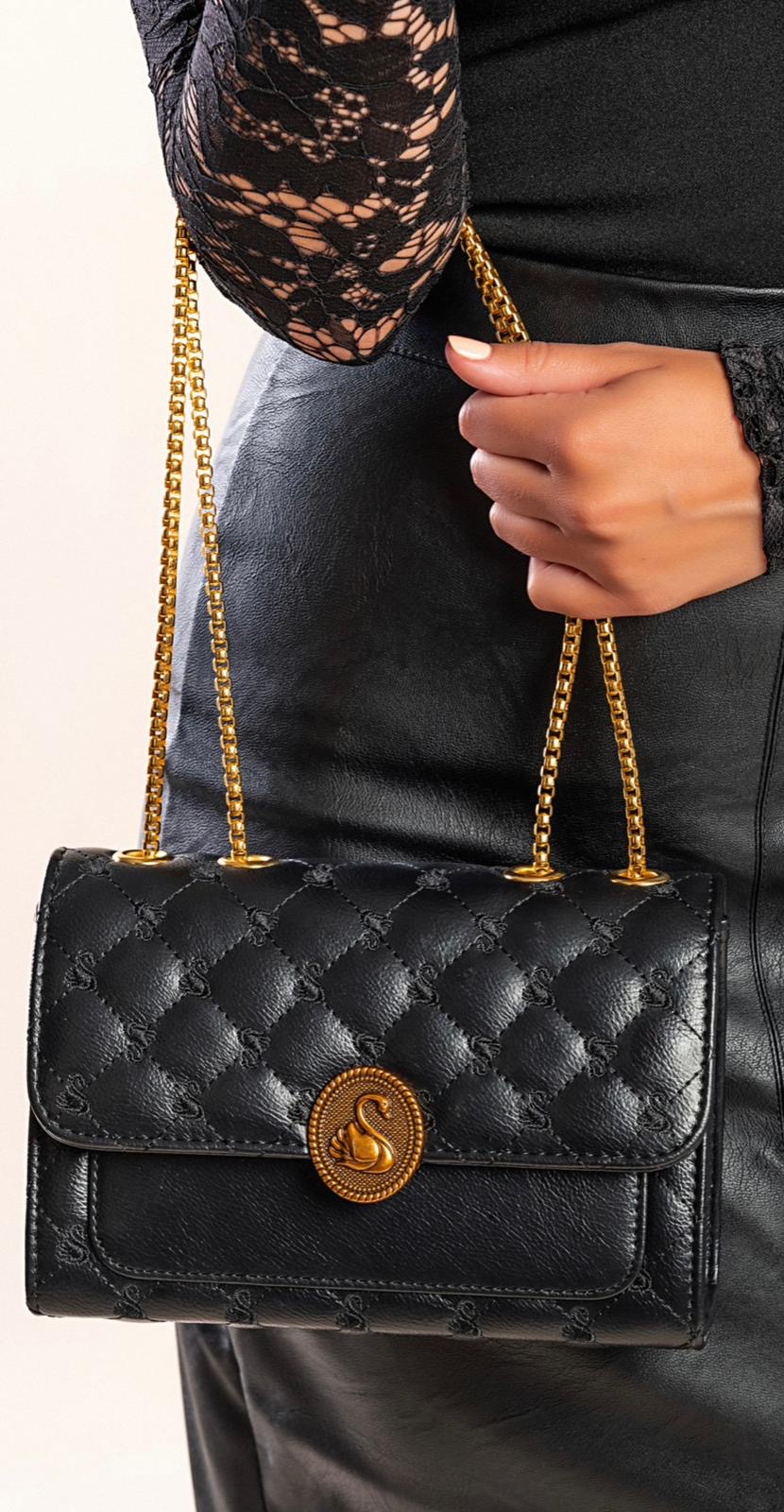 Modni dizajn, zapiranje z gumbom, prešita zunanjost. Dodana dolga zlata naramnica.
