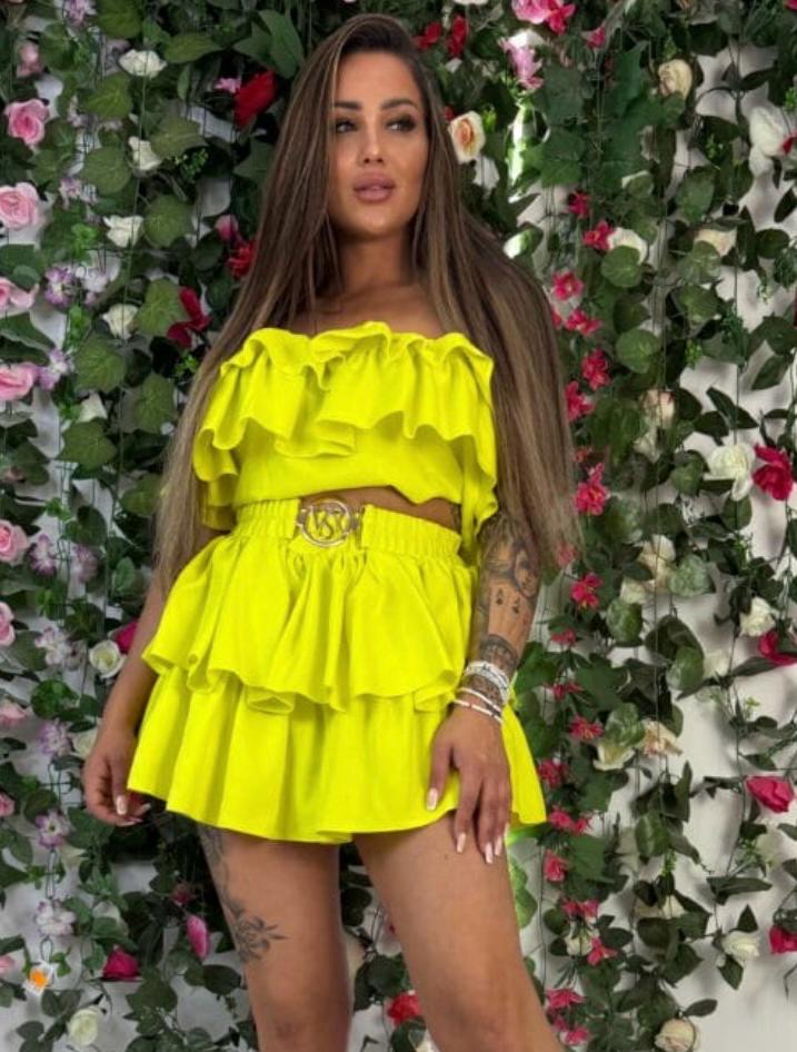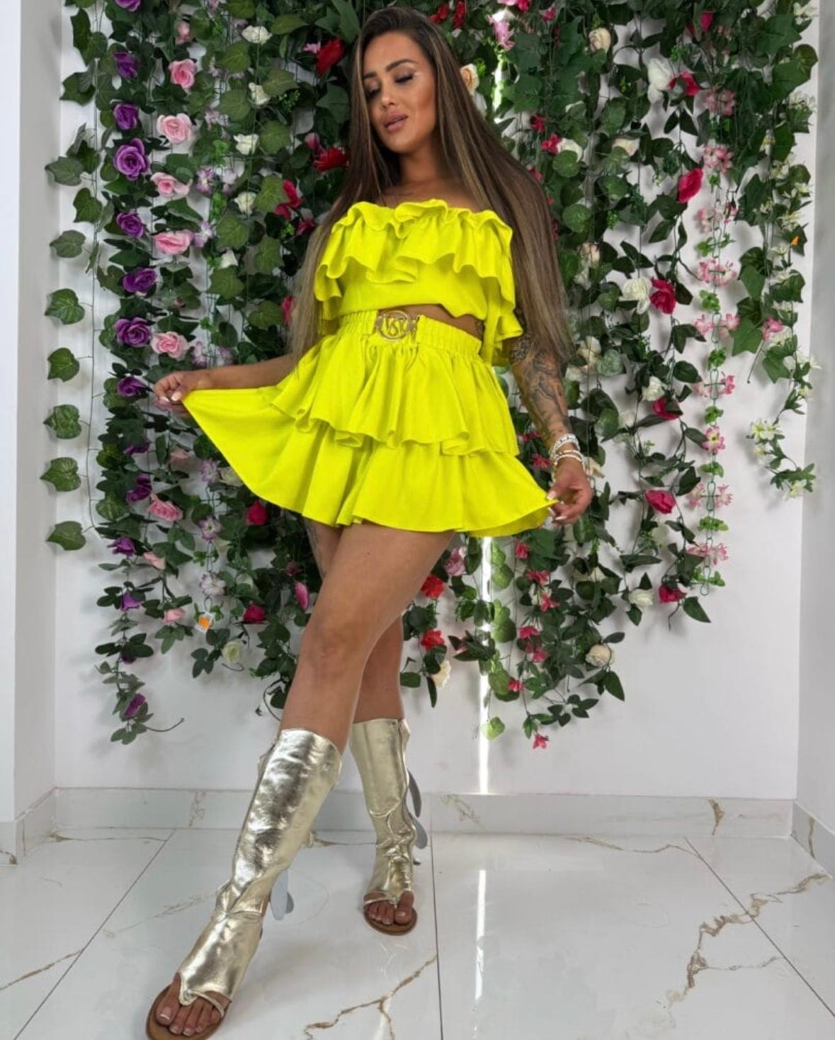 Dvodelni poletni komplet s hlačnim krilom in topom, ki ga lahko nosiš na kar 3 načine. Na ramena, na eno ramo, ali kar brez, lahko ga popraviš v krilo ali ga nosiš kot top. Kompletek je univerzalne velikosti , primeren od 36-42.