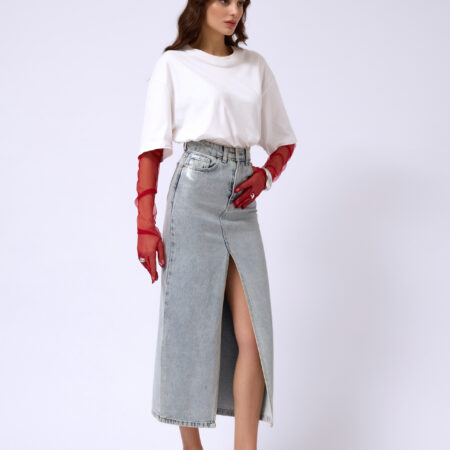 Jeans dolgo krilo z srebrnim potiskom, bo tvoj najljubši kos to jesen. Krilo ne vsebuje elastana, saj je iz 100% bombaža, priporočamo nakup številko.